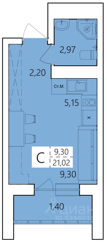 Студия, 21,02 м²