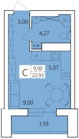 Общая площадь22,93 м²