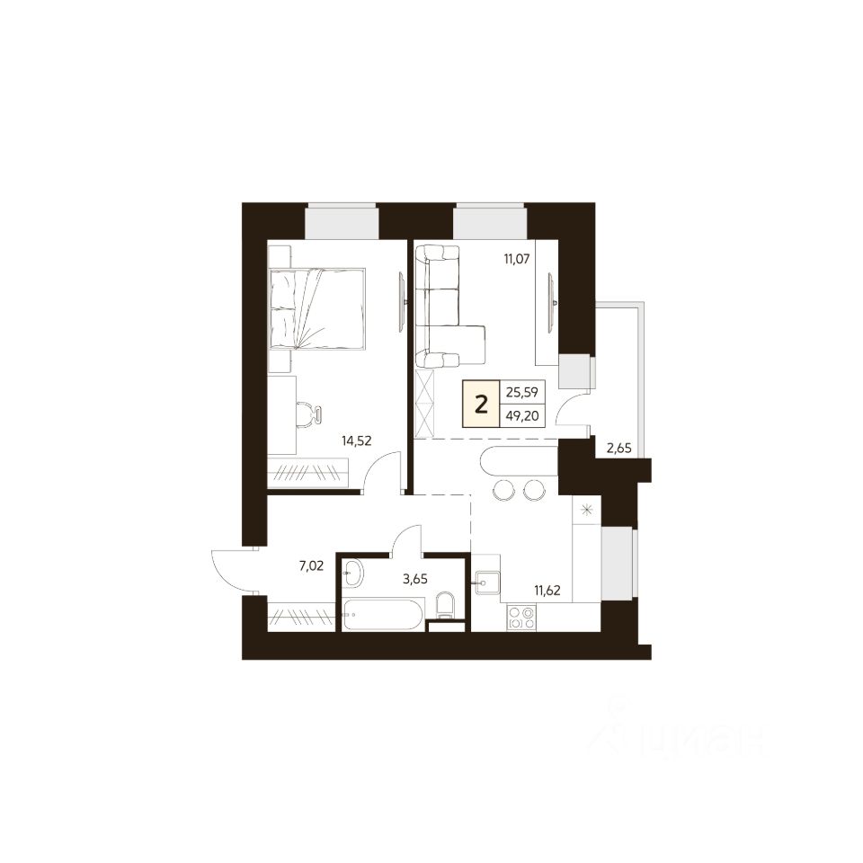 Продаётся 2-комнатная квартира в строящемся доме (Дом 2), срок сдачи: I-кв. 2026, общей площадью 49.2 кв.м., на 10 этаже.