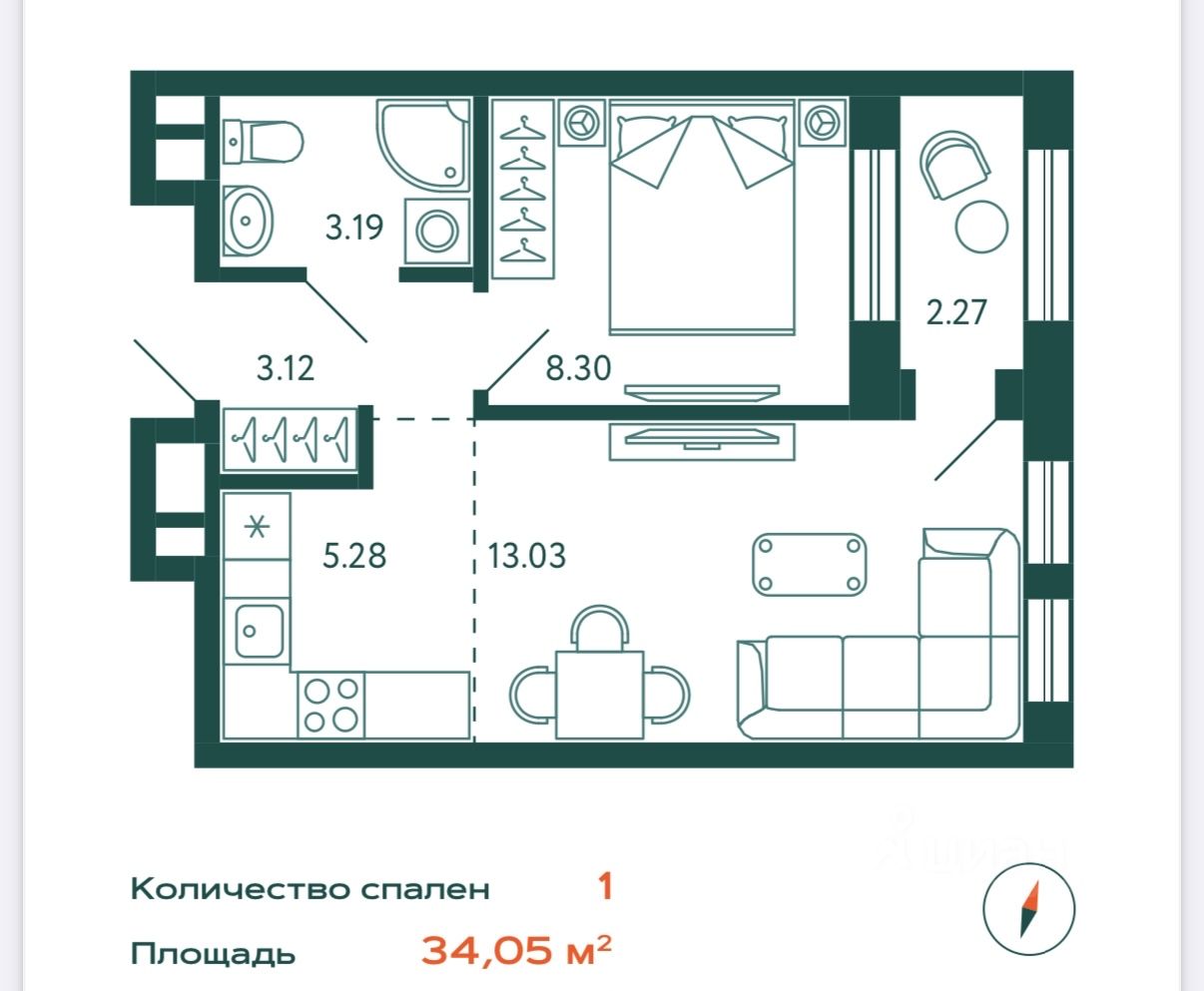 34,05 м²