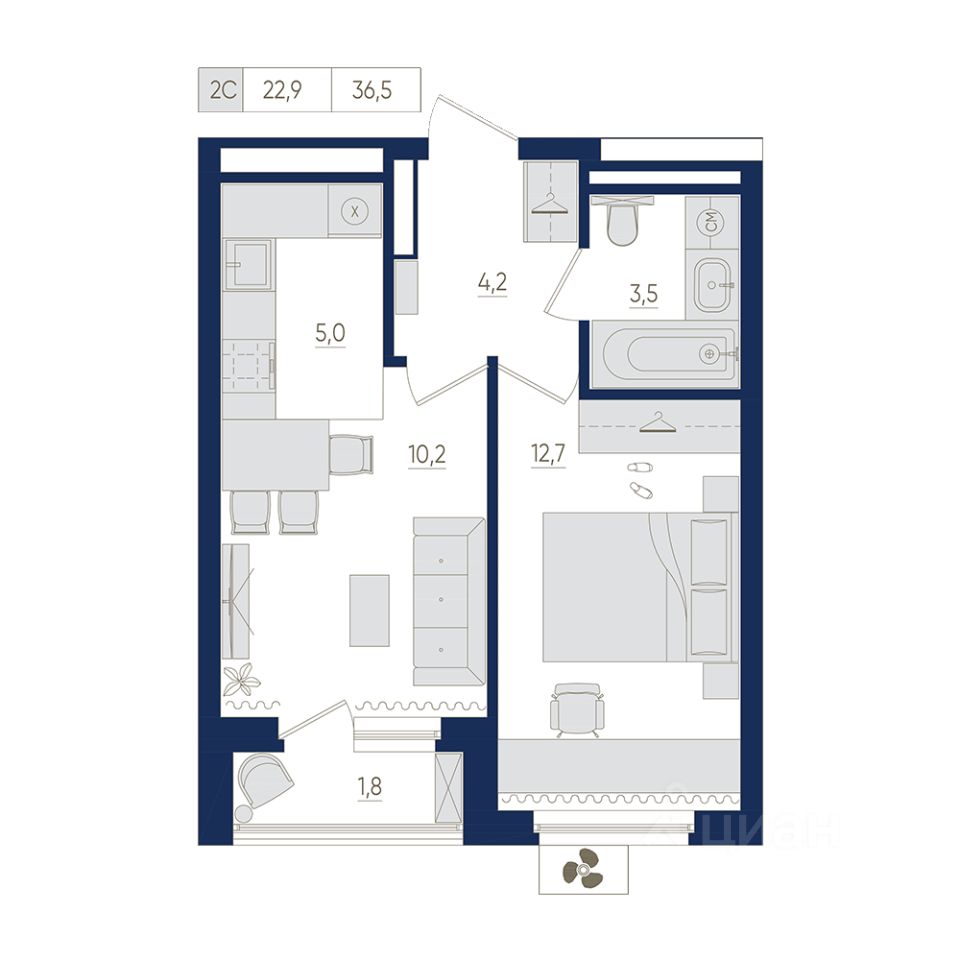 13-й этаж 22 - этажного жилого дома, общая площадь 36.5 кв. м., жилая площадь 20.1 кв. м. Срок окончания строительства: 2 квартал 2026 года