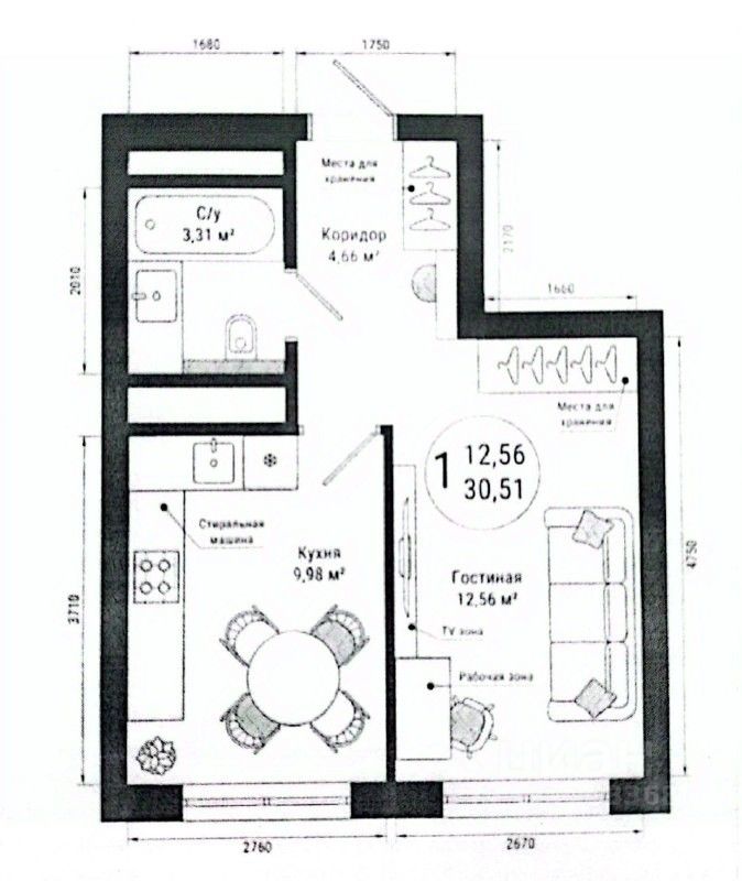 - Площадь квартиры 30,51 м²