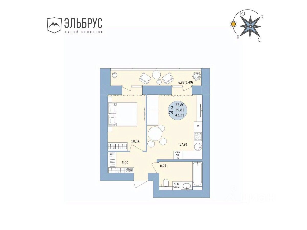 лоджия — 3,49 кв.м.,