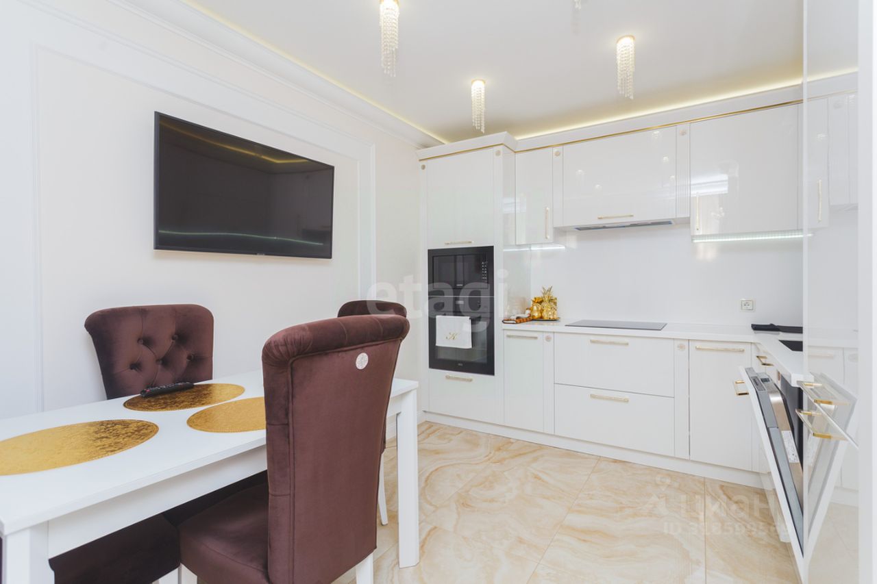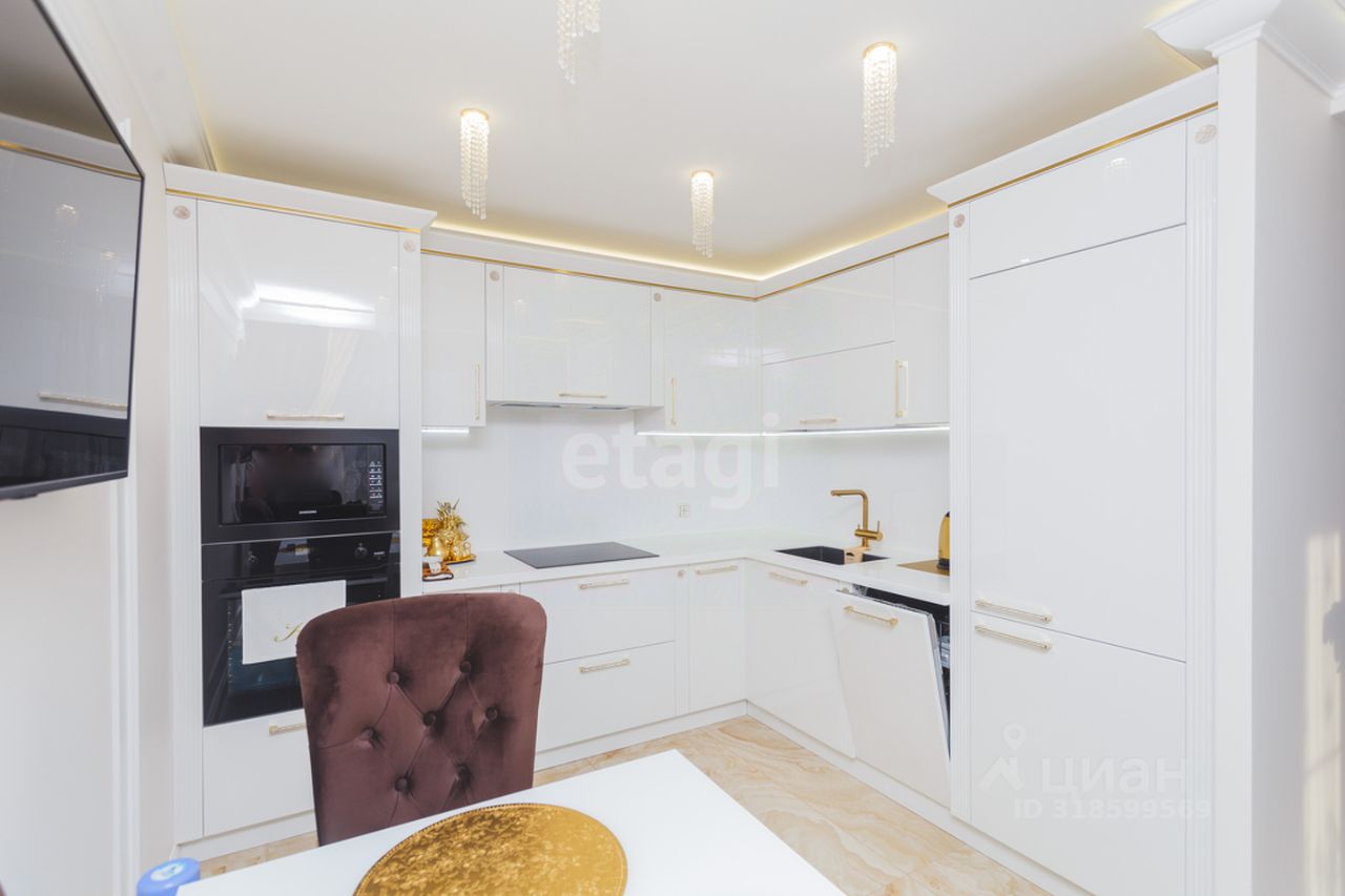 В квартире вся мебель и техника, включая кухонный гарнитур со встроенной техникой и столешницей из заливного камня, а также инверторный кондиционер, остаются новому владельцу. При ремонте были использованы экологичные материалы, повсеместно выполнена шумоизоляция потолка и пола для обеспечения тишины. Особенности интерьера включают дизайнерскую резную арку в зале, итальянский керамогранит, европейскую сантехнику и авторские шторы.