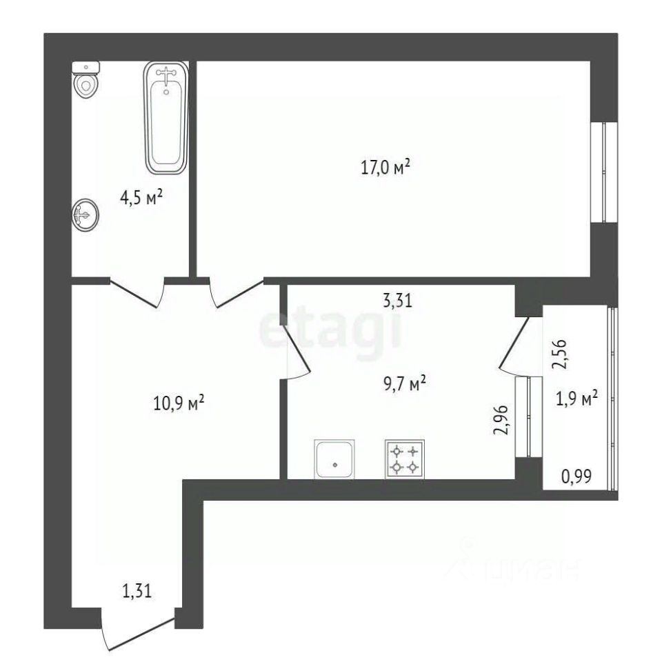 большая кухня 9,7 кв.м. и отдельная изолированная квадратная комната 17 кв.м.