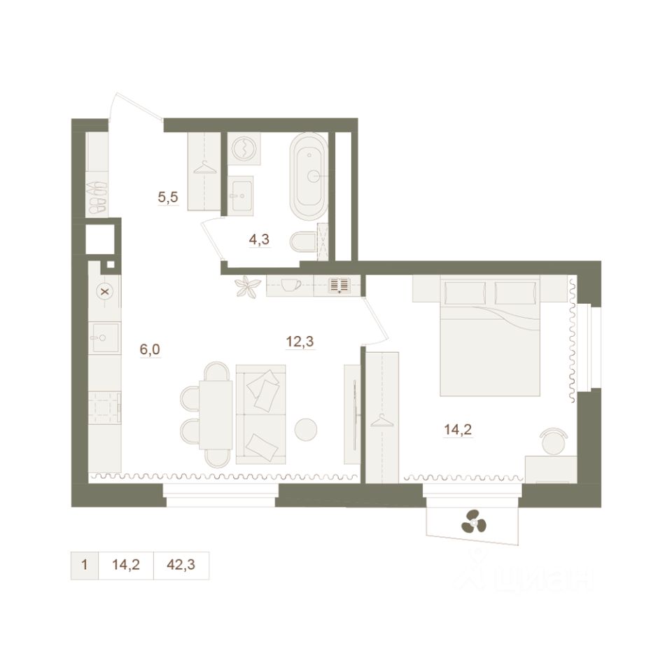 Общая площадь42,3 м²