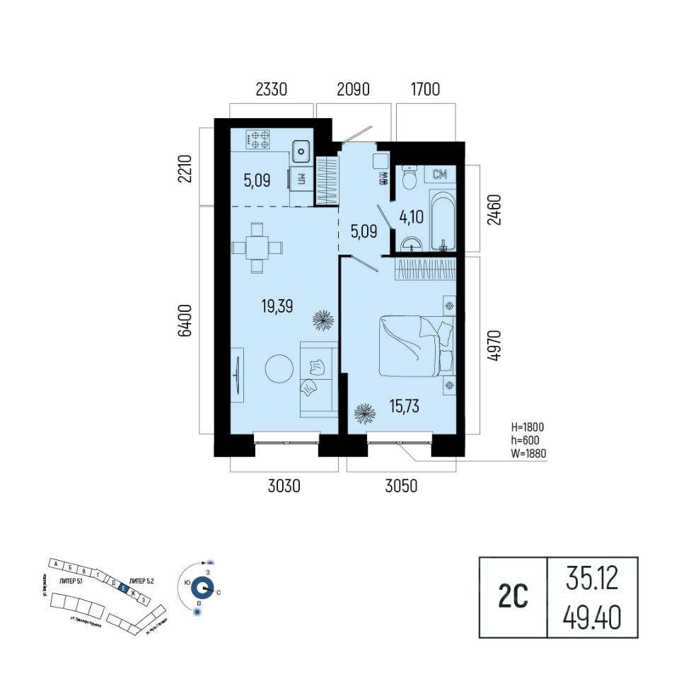 Общая площадь 49.40кв.м.;