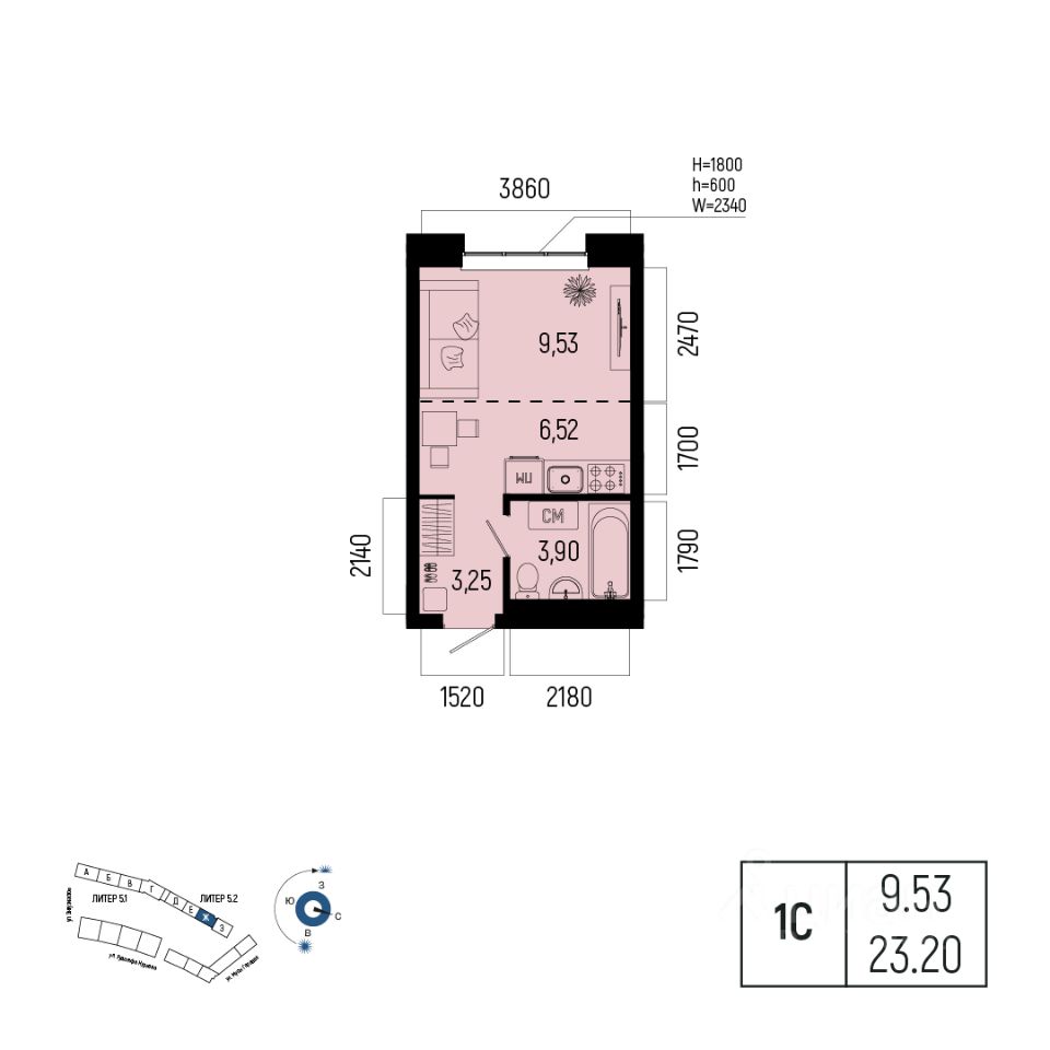 Общая площадь 23.20кв.м.;