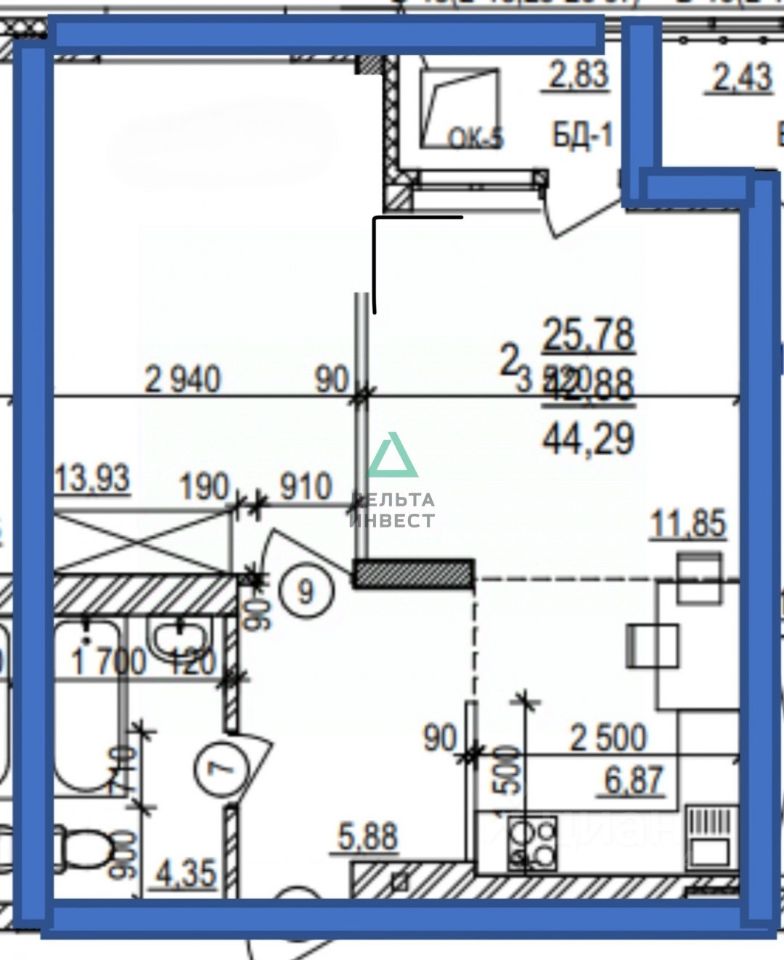 Общая площадь 44,3 м2.