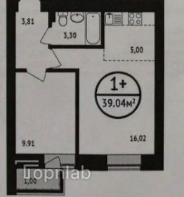 Общая площадь: 39,04м2. Кухня- гостинная: 21,2м 2. Спальня: 10 м2. Коридор:3,81м2. Санузел: 3,30м2. Лоджия: 1 м2.