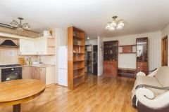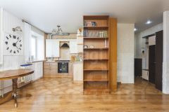 В кухне-гостиной уложен ламинат и плитка в зоне кухни, под ними сделана стяжка пола (демонтаж старого дерева выполнен)