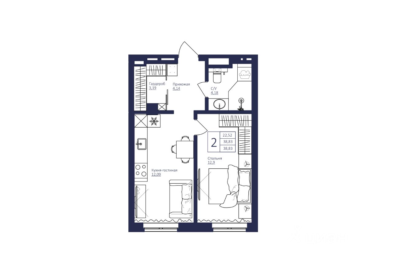 Общая площадь38,83 м²