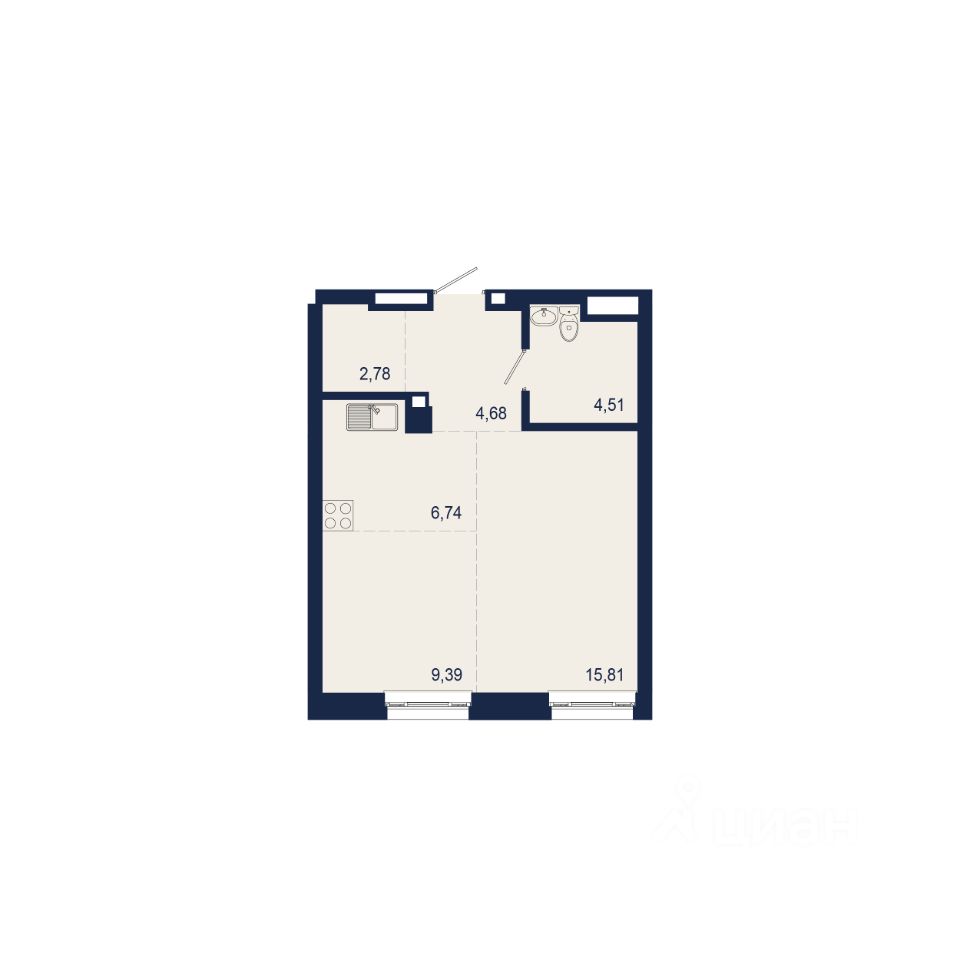 Общая площадь: 43,91 м²