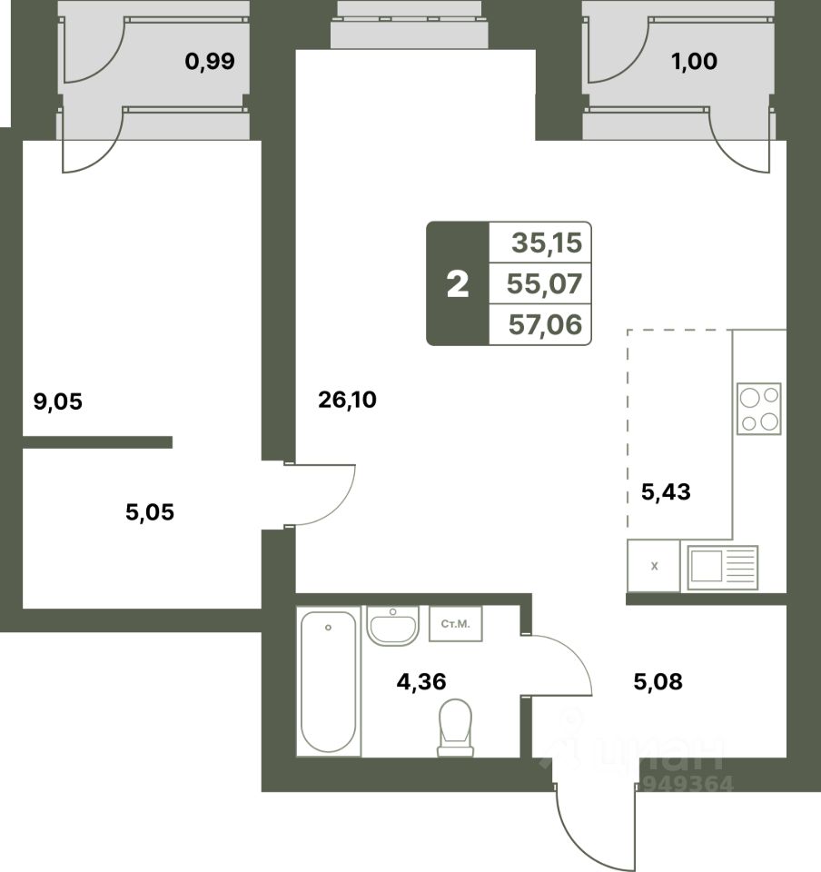 57,06 м²