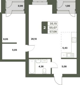 Продается 2-к-комнатная квартира в ЖК "Свой Берег" от ГК "Архстрой Групп". 1-й этаж 6-этажного жилого дома, общая площадь 57.06 кв.м., жилая площадь 35.15 кв.м. Отделка получистовая.