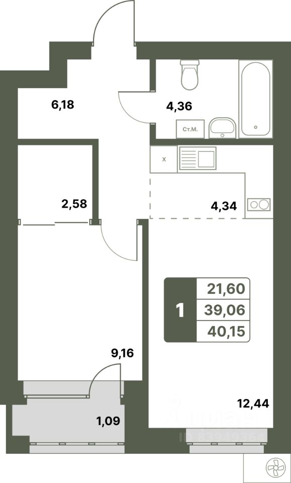 Общая площадь40,15 м²