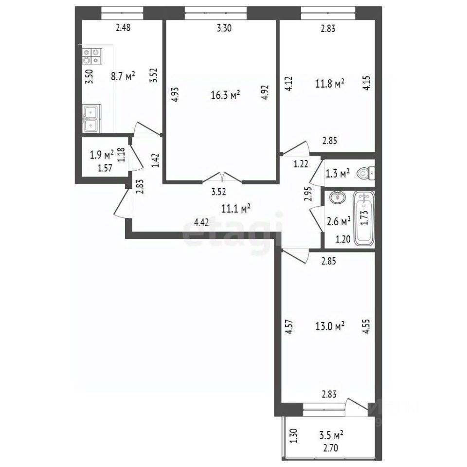 Зал: 16,3 кв.м.