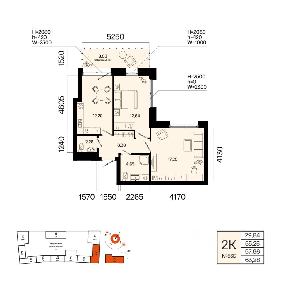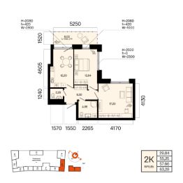 Общая площадь 57.66кв.м.;