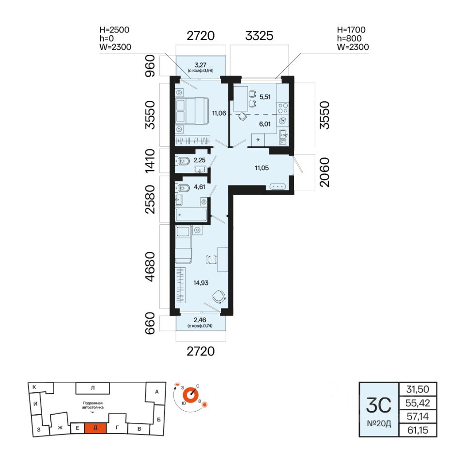 Общая площадь 57.14кв.м.;