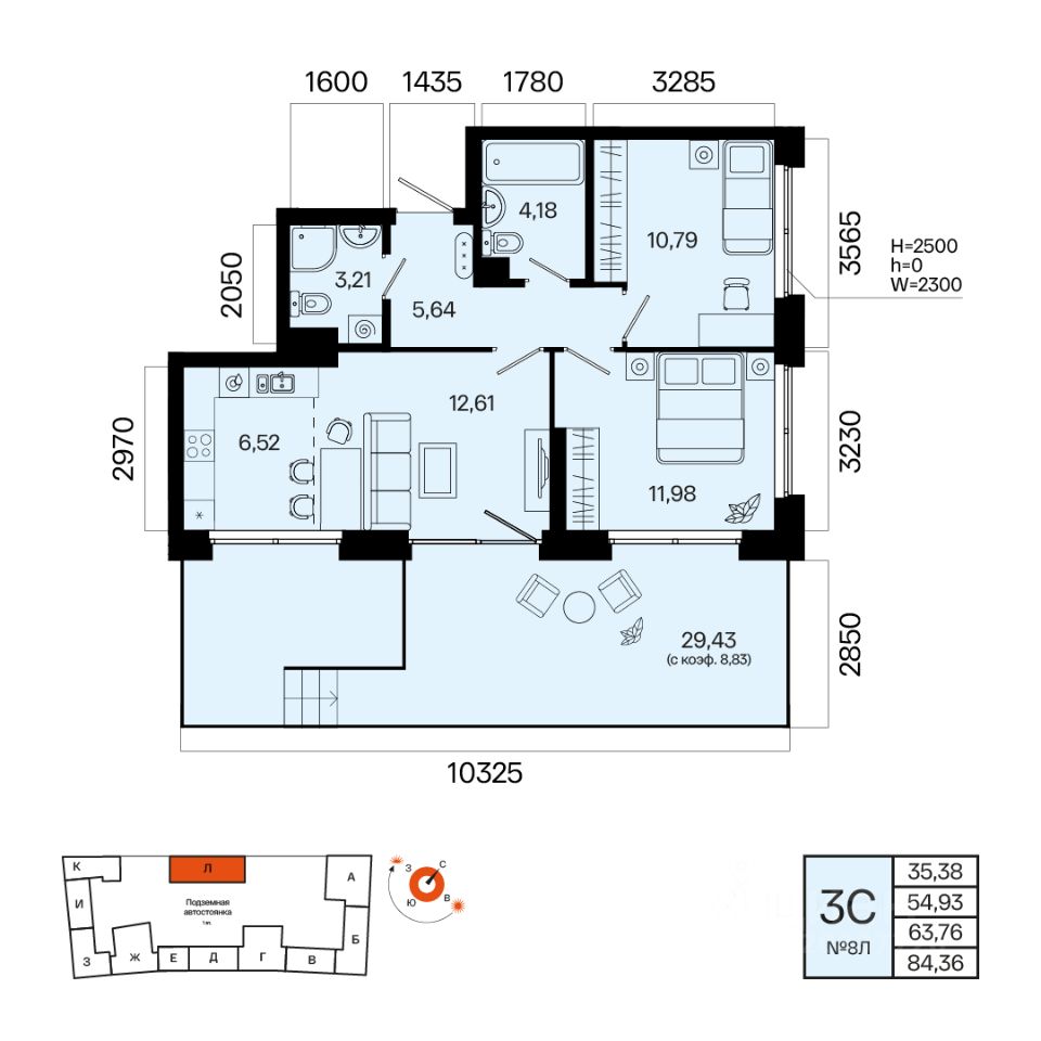 Общая площадь 63.76кв.м.;