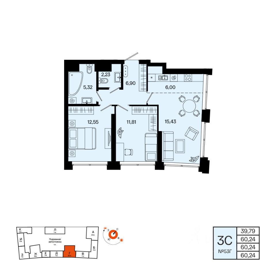 Общая площадь 60.24кв.м.;