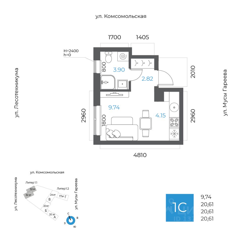 Общая площадь 20.61кв.м.;