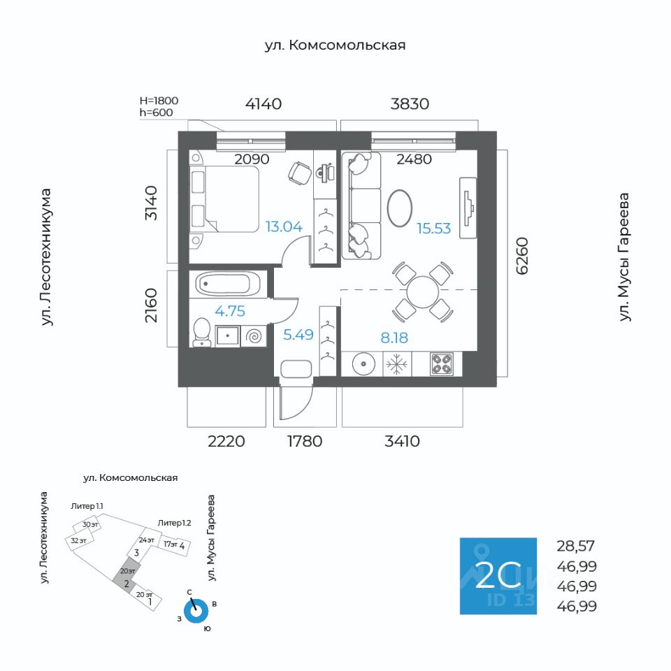 Общая площадь 46.99кв.м.;