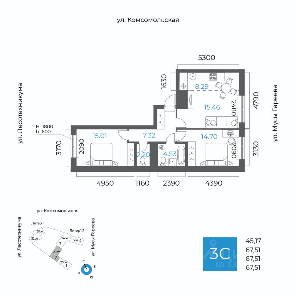 Общая площадь 67.51кв.м.;