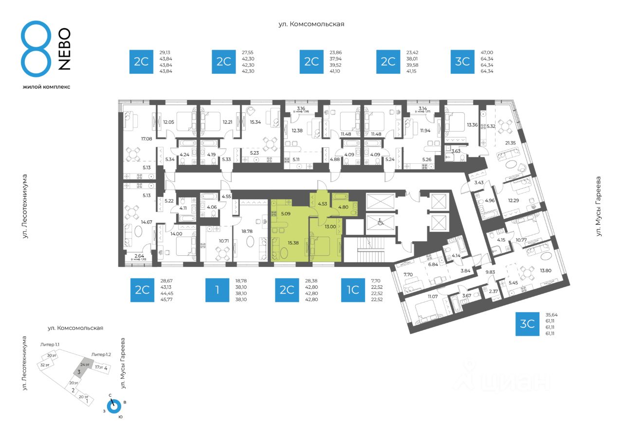 Литер 1.2, Секция 3. 14-й этаж 24- этажного жилого дома