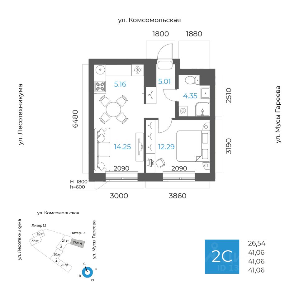 Общая площадь 41.06кв.м.;