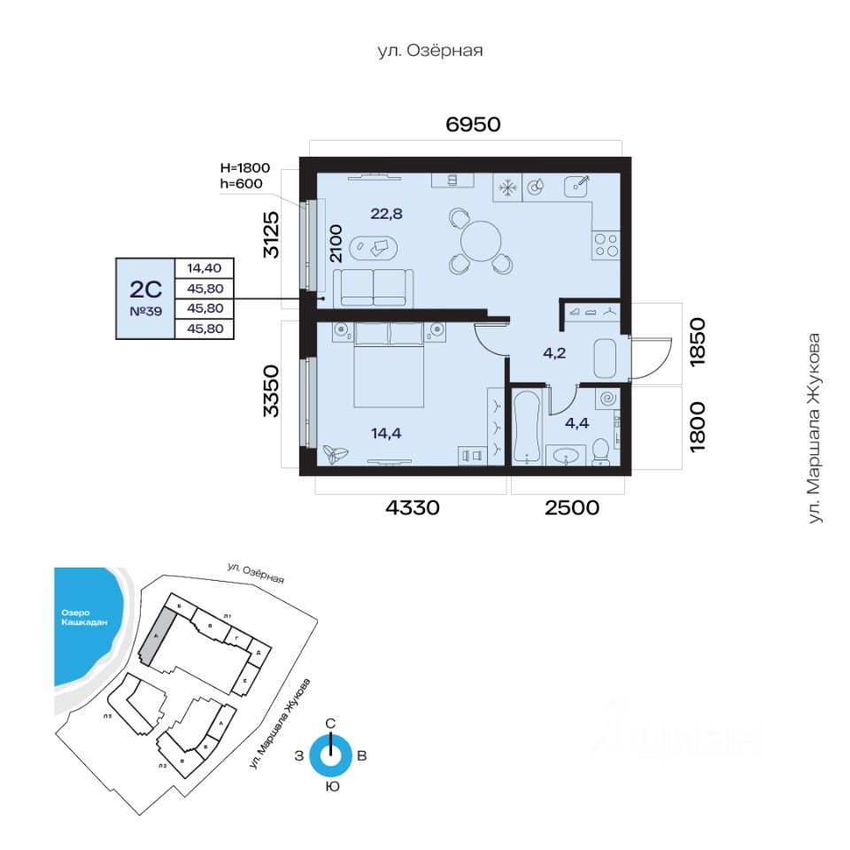 Общая площадь 45.80кв.м.;