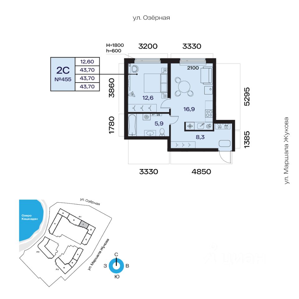 Общая площадь 43.70кв.м.;