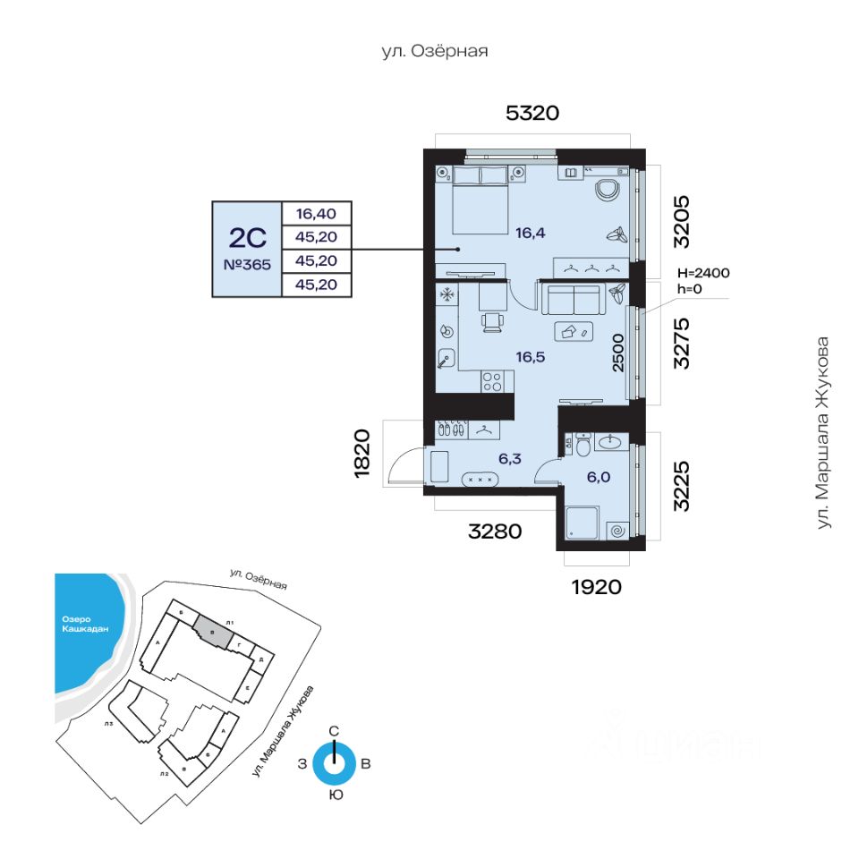 Общая площадь 45.20кв.м.;