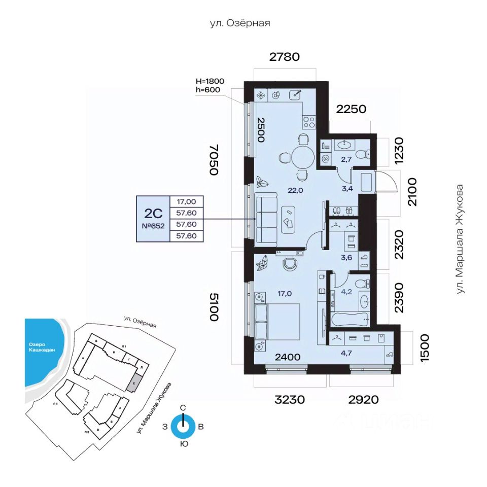 Общая площадь 57.60кв.м.;