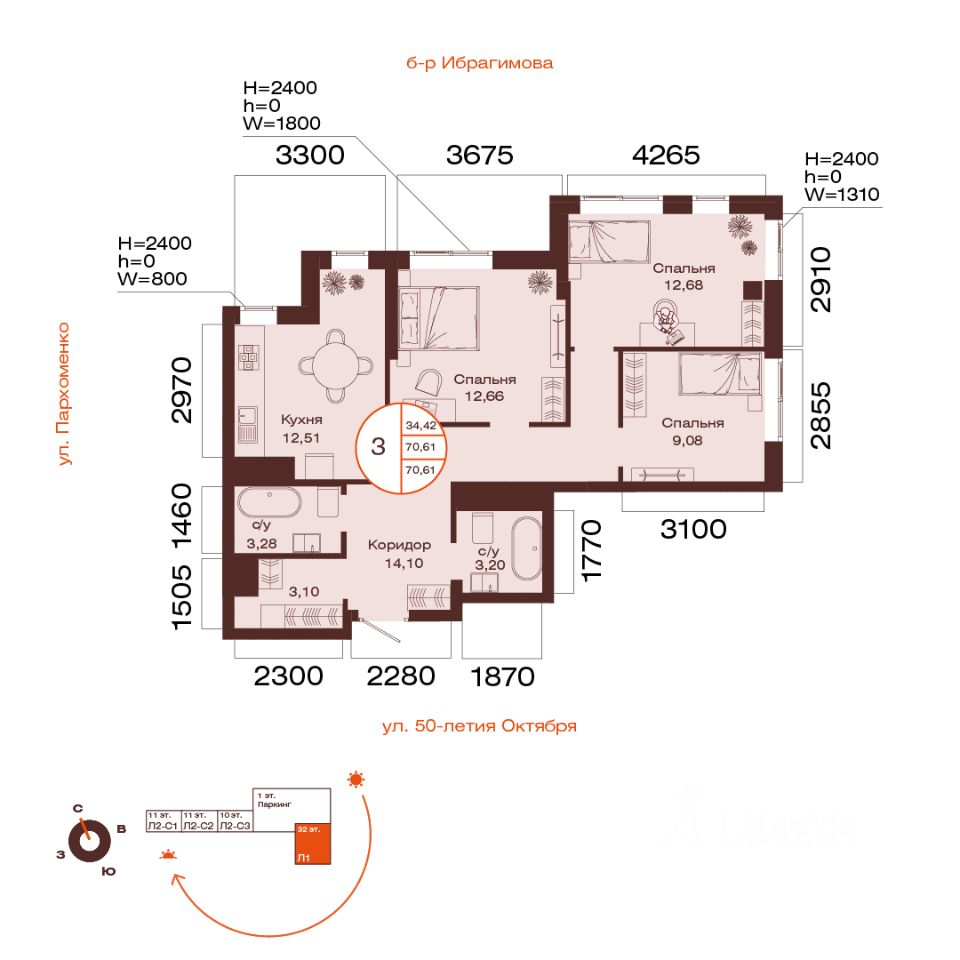 Общая площадь 70.61кв.м.;