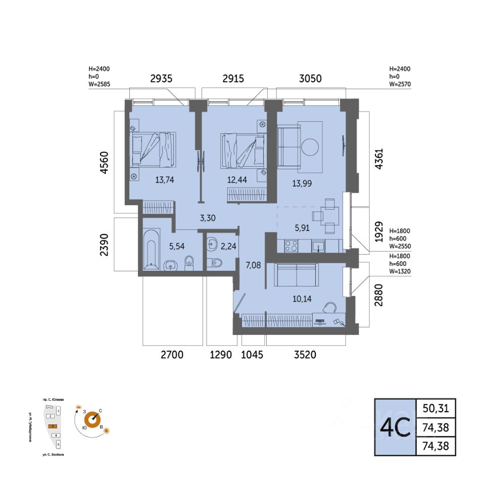 Общая площадь 74.38кв.м.;