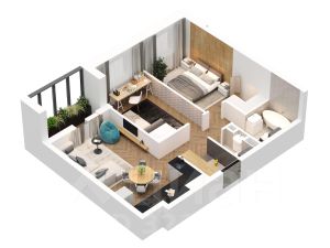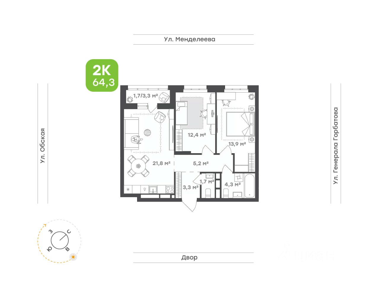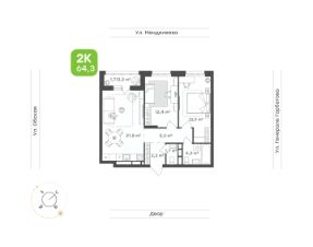 Двухкомнатная квартира для семьи с детьми или молодых людей 64,3 м • Просторная кухня-гостиная 21,8 м с выходом на балкон, который можно обустроить под кабинет или зону отдыха • Спальня 13,9 м • Уютная детская 12,4 м • Два санузла 4,3 м и 1,7 м • Функциональный холл 8,5 м с возможностью обустроить мини-гардеробную
