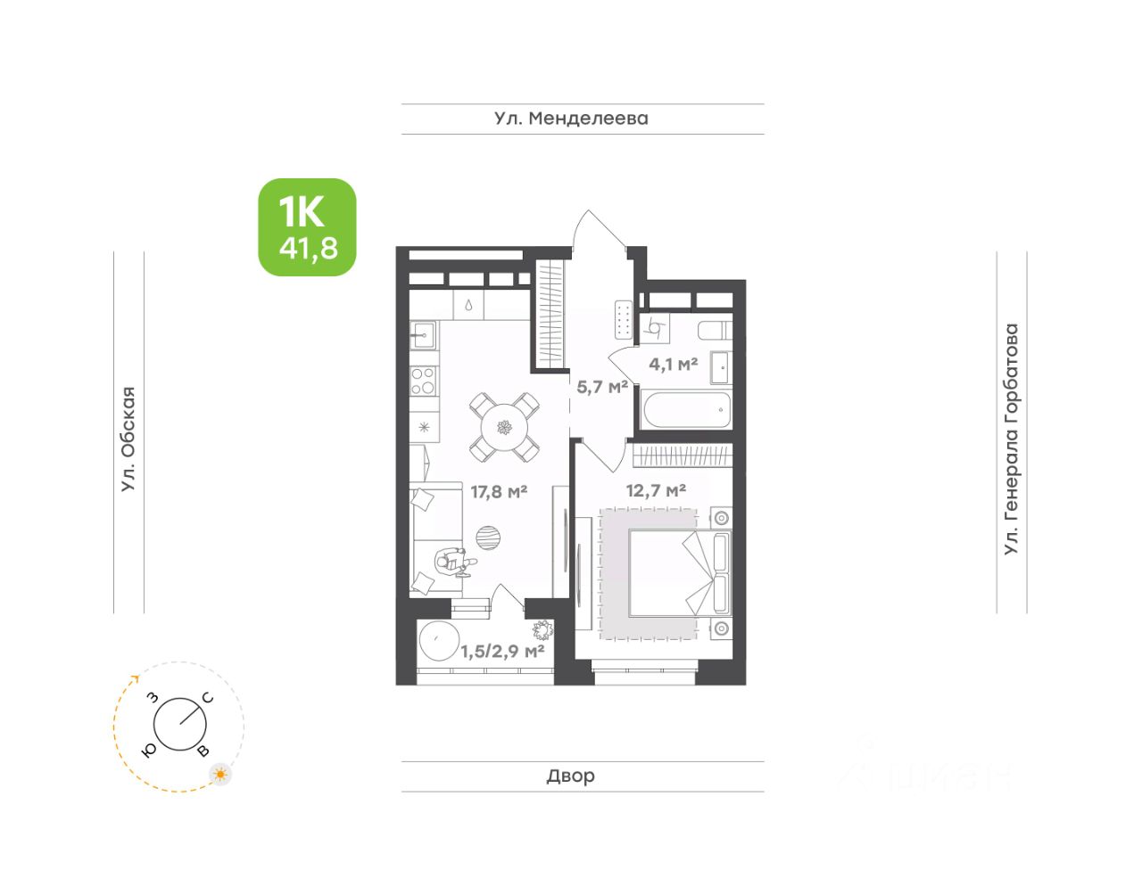 • Видовая однокомнатная квартира для семейной пары или молодых людей 41,8 м