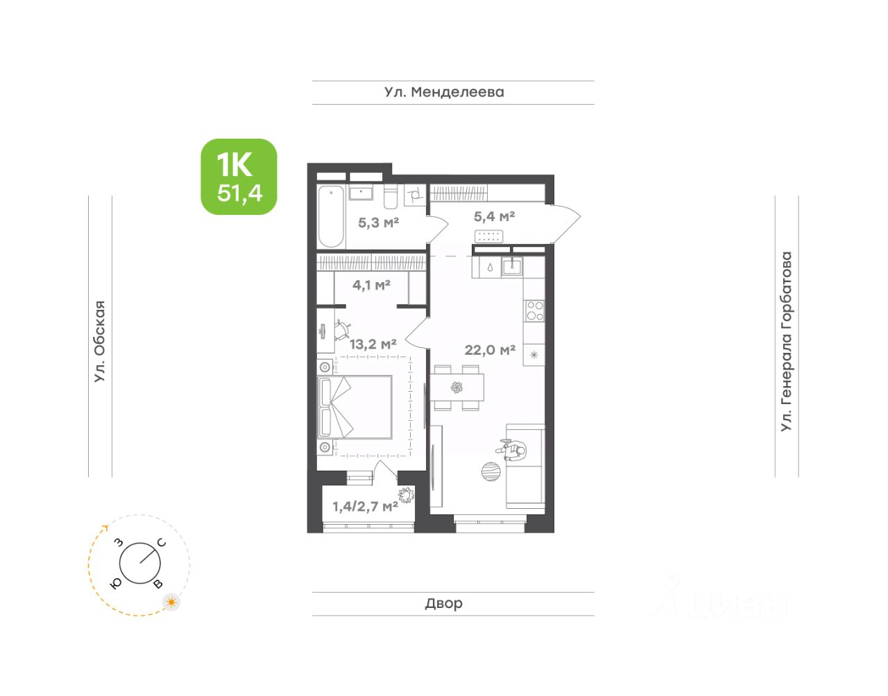 • Аутентичная однокомнатная квартира для семейной пары или молодых людей 51,2