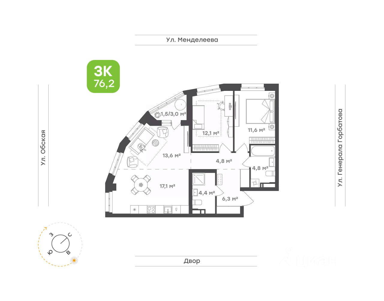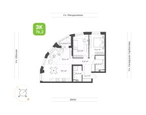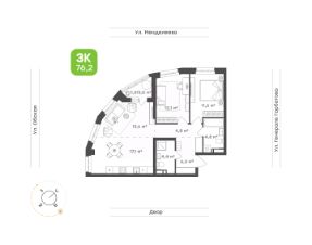 • Трехкомнатная квартира для семьи с детьми или молодых людей 76,2 м