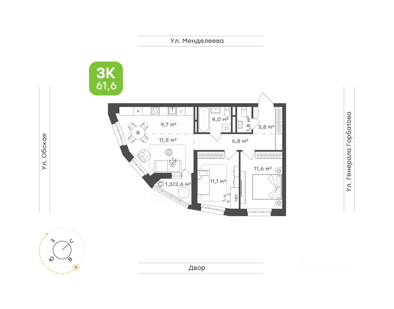• Трехкомнатная квартира для семьи с детьми или молодых людей 61,6 м