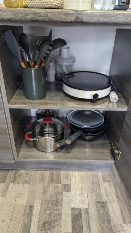 холодильник, микроволновка, индукционная плитка, капсульная кофемашина, блендер, чайник, всевозможный набор посуды;