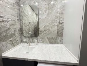 Современный гостевой санузел, облицованный качественным искусственным камнем.