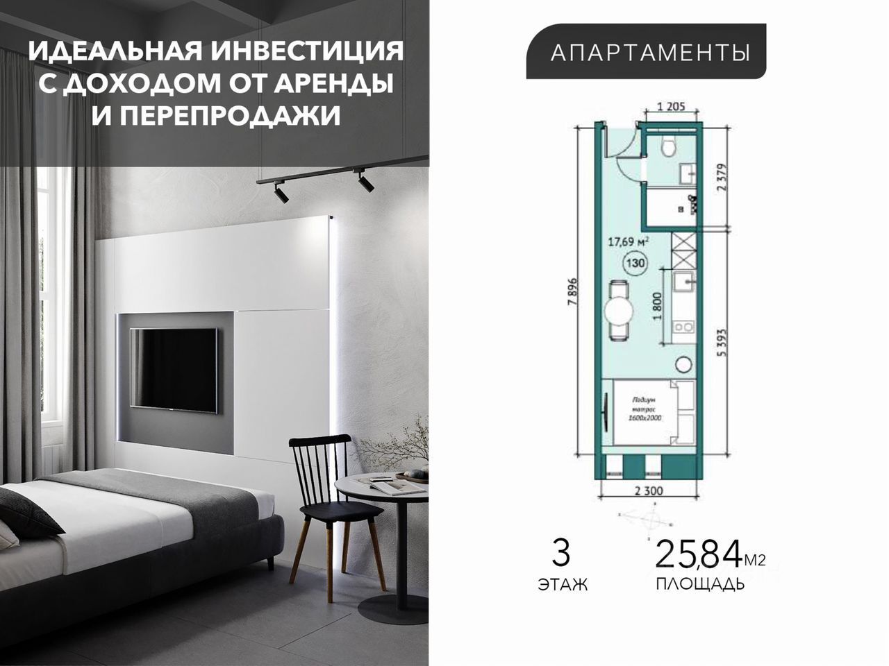 - Площадь: 17,69 м² (с МОП — 25,84 м²)