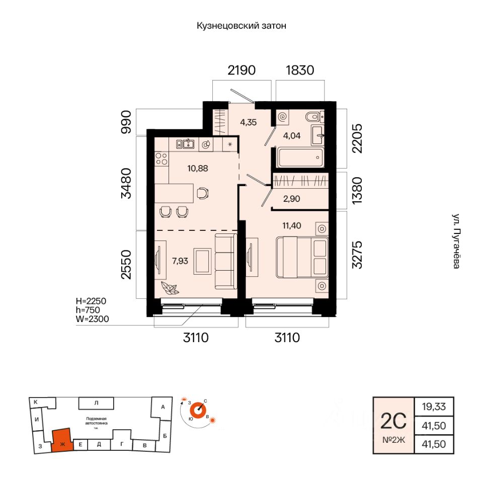 Общая площадь 41.50кв.м.;