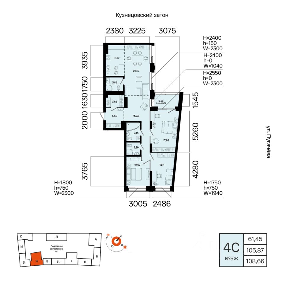 Общая площадь 108.66кв.м.;