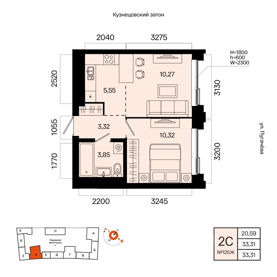 Общая площадь 33.31кв.м.;