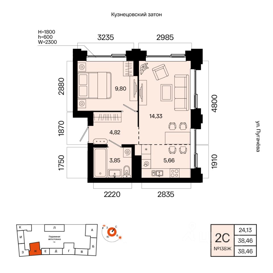 Общая площадь 38.46кв.м.;