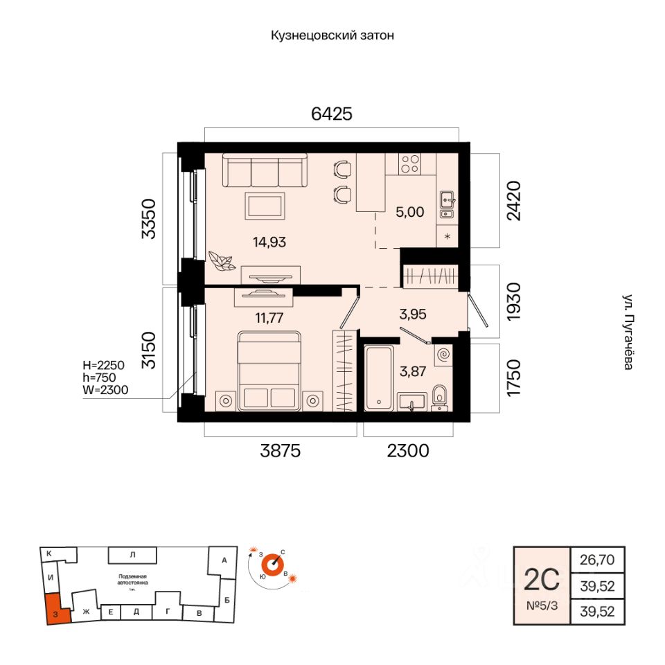 Общая площадь 39.52кв.м.;