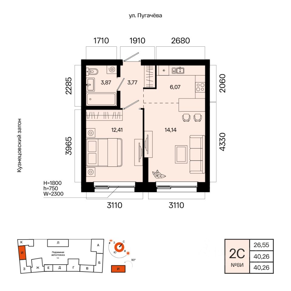 Общая площадь 40.26кв.м.;